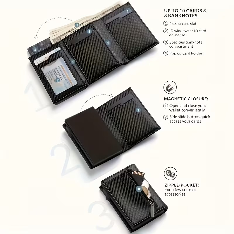 Men's Wallet with Zipper Coin Pocket Automatic Pop-up Metal Credit Card Holder Minimalist RFID